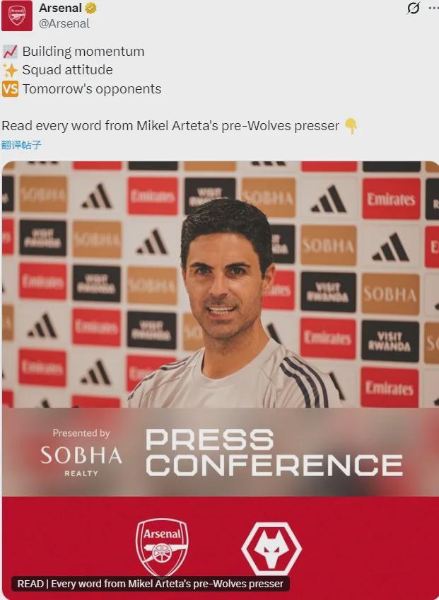 阿尔特塔出席了赛前新闻发布会,我们来看主要内容。