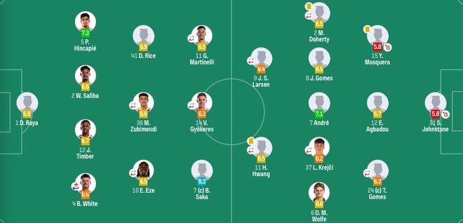 阿森纳首发:1-拉亚、4-本怀特(31'49-斯凯利)、2-萨利巴、5-因卡皮耶、12-廷贝尔、41-赖斯、36-苏比门迪(57'23-梅里诺)、10-埃泽(57'8-厄德高)、7-萨卡、11-马丁内利(57'19-特罗萨德)、14-哲凯赖什(81'9-热苏斯)